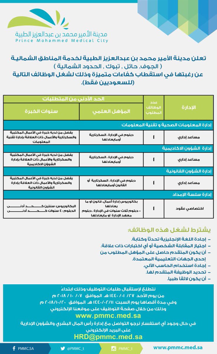 أعلنت مدينة الأمير محمد بن عبدالعزيز الطبية لخدمة المناطق الشمالية (الجوف، وحائل، وتبوك، والحدود الشمالية)، توفر وظائف إدارية شاغرة، لحملة الدبلوم والبكالوريوس، للعمل بمسمى (مساعد إداري، واختصاصي عقود)، وذلك وفقاً للشروط والمواعيد الموضحة أدناه.