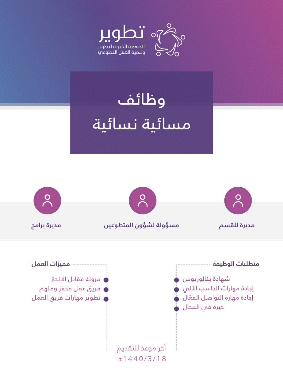 أعلنت الجمعية الأهلية لتطوير وتنمية العمل التطوعي (جمعية تطوير) توفر وظائف مسائية شاغرة للرجال والنساء، للعمل بالجمعية بمنطقة القصيم في الفترة المسائية، بالمسميات التالية (مديرة للقسم، ومسؤول لشؤون المتطوعين، ومديرة برامج، وخبير جودة، ومسؤول التدريب، ومصور وممنتج، ومدير برامج)، وذلك وفقاً للشروط وطريقة التقديم الموضحة أدناه.