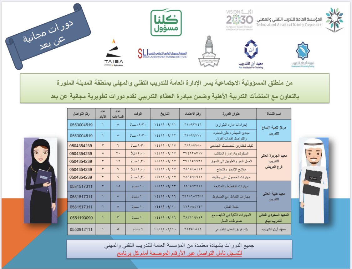 أعلنت إدارة التدريب التقني بمنطقة المدينة المنورة توفر 12 دورة تدريبية مجانية (عن بُعد)، بشهادات مُعتمدة من المؤسسة العامة للتدريب التقني والمهني، وذلك بالتعاون مع المنشآت التدربيية الأهلية وضمن مبادرة العطاء التدريبي، وذلك وفقاً للتفاصيل الموضحة أدناه.