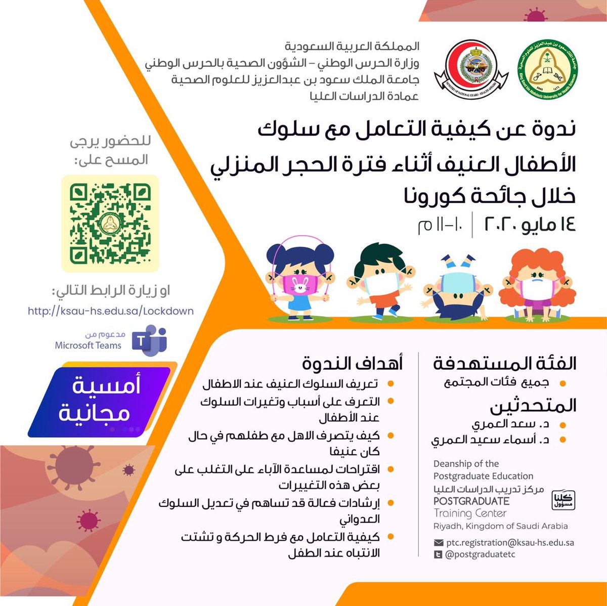 أعلنت جامعة الملك سعود للعلوم الصحية التابعة مُمثلة في عمادة الدراسات العليا بالتعاون مع الشؤون الصحية بالحرس الوطني تقديم ندوة (مجانية) تُقام (عن بُعد) بعنوان (كيفية التعامل مع السلوك الأطفال العنيف أثناء فترة الحجر المنزلي خلال جائحة كورونا)، وذلك وفقاً للتفاصيل الموضحة أدناه.