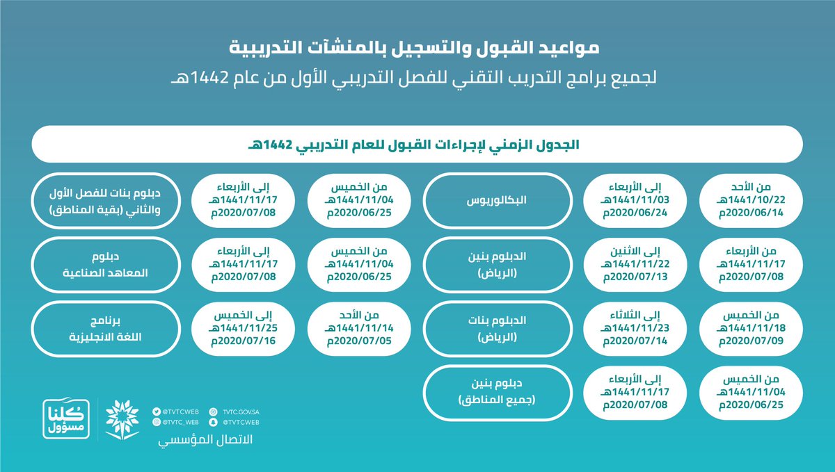 أعلنت المؤسسة العامة للتدريب التقني والمهني مواعيد القبول والتسجيل بالمنشآت التدريبية لجميع برامج التدريب التقني للفصل التدريبي الأول من عام 1442هـ (في جميع مناطق المملكة)، وذلك وفقاً للتفاصيل الموضحة أدناه.