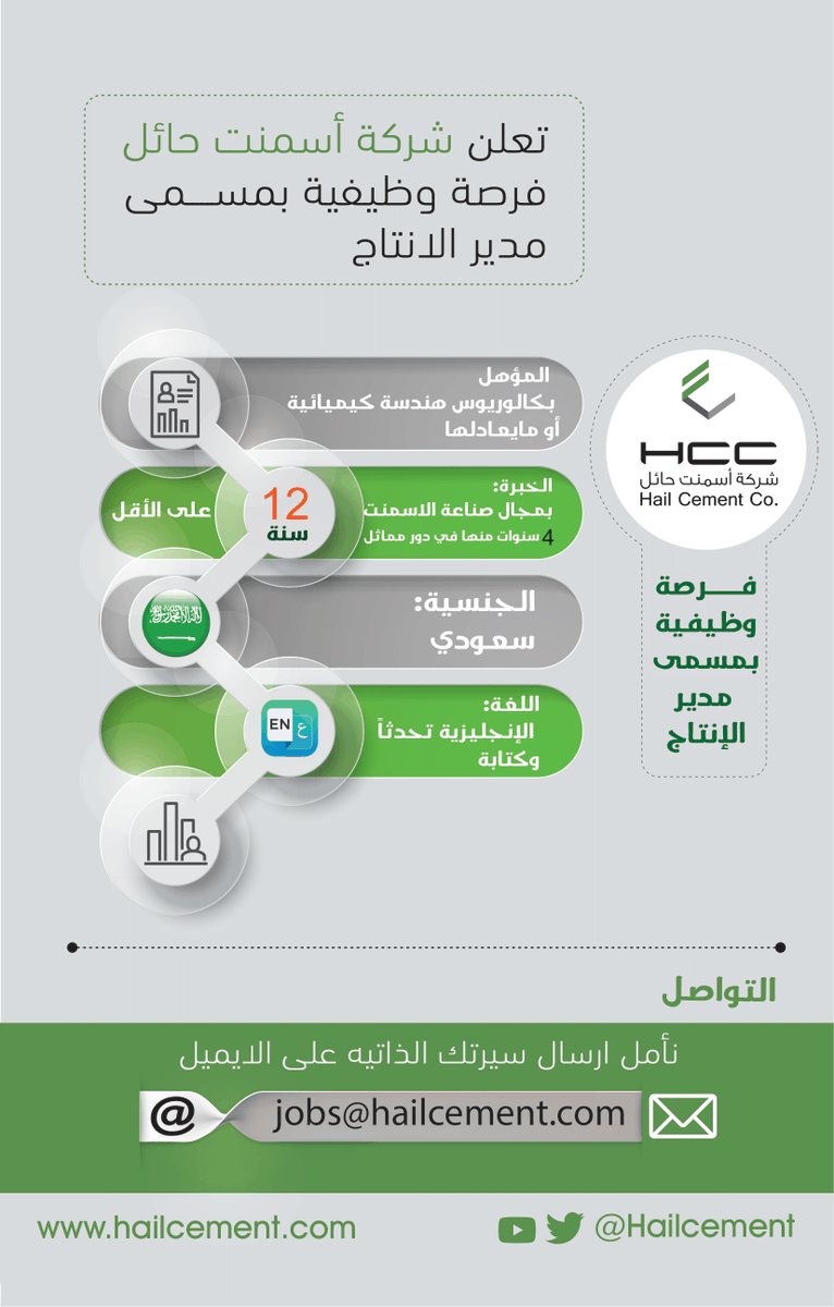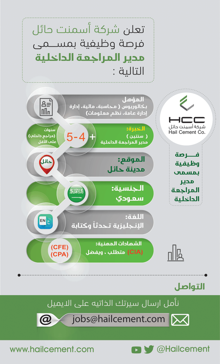 أعلنت شركة أسمنت حائل توفر وظائف إدارية وهندسية شاغرة لذوي الخبرة، للعمل بالمسميات التالية (مدير المراجعة الداخلية، ومدير الإنتاج)، وذلك وفقاً للتفاصيل وطريقة التقديم الموضحة أدناه.