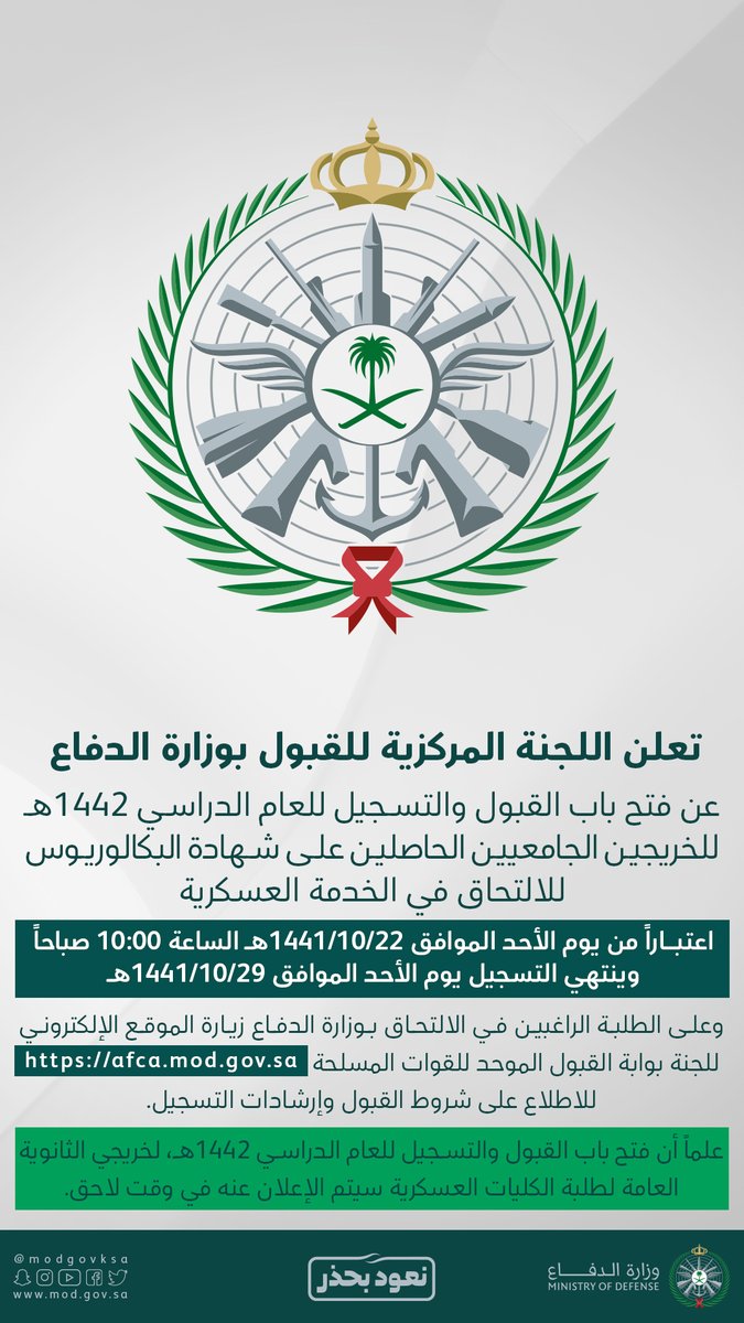 أعلنت وزارة الدفاع مُمثلة في اللجنة المركزية للقبول فتح باب القبول والتسجيل للعام الدراسي (1442هـ) للخريجين الجامعيين الحاصلين على شهادة البكالوريوس للالتحاق في الخدمة العسكرية، وذلك وفقاً للشروط وطريقة التقديم الموضحة أدناه.