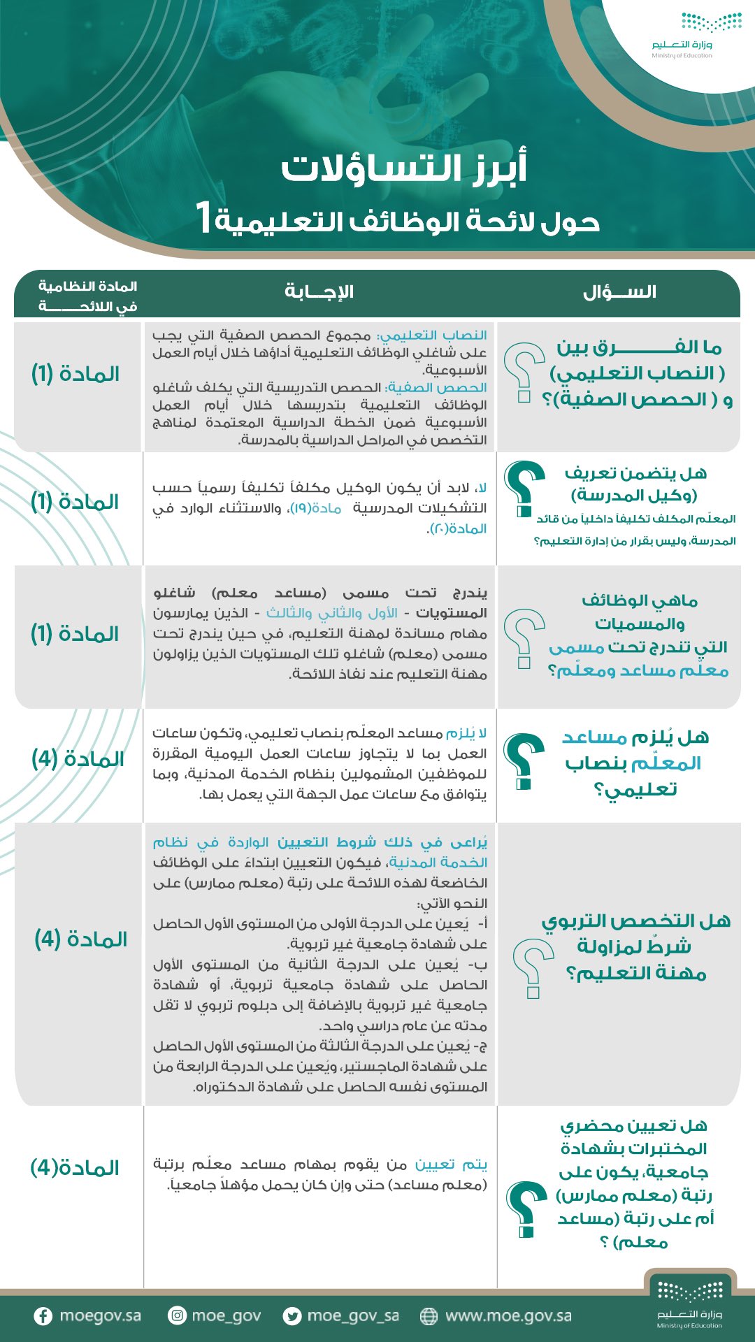 أعلنت وزارة التعليم ووزارة الموارد البشرية والتنمية الاجتماعية وهيئة تقويم التعليم والتدريب ووزارة المالية أن (يوم الأربعاء القادم 1441/11/10هـ الموافق 2020/07/01م) سوف يتم تطبيق لائحة الوظائف التعليمية الجديدة، بناء على قرار وزير الخدمة المدنية (سابقاً) رئيس لجنة البت في شأن اللوائح التنفيذية الذي اقتضى أن يكون نفاذ اللائحة بتاريخ 1441/11/10هـ، وذلك بعد إجراء تعديلات اقترحتها وزارة التعليم على اللائحة بناءً على آراء المعلمين والمشرفين فى الميدان التعليمي وبمشاركة وزارة الخدمة المدنية (سابقاً) في تلك التعديلات؛ وبما يحقق مصلحة مهنة التعليم ومزايا أفضل للمعلمين والمعلمات.