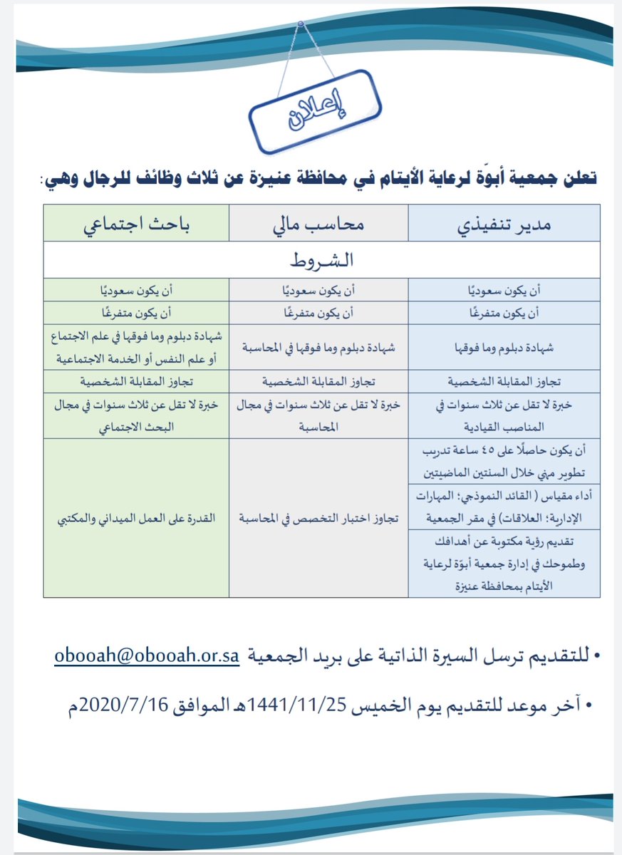 أعلنت جمعية أبوّة لرعاية الأيتام في عنيزة توفر 3 وظائف شاغرة (للرجال) لحملة الدبلوم فما فوق، للعمل بالمسميات التالية (مدير تنفيذي، مُحاسب مالي، باحث اجتماعي)، واشترطت الجمعية أن يكون المتقدم سعودي الجنسية، وذلك وفقاً للشروط وطريقة التقديم الموضحة أدناه.