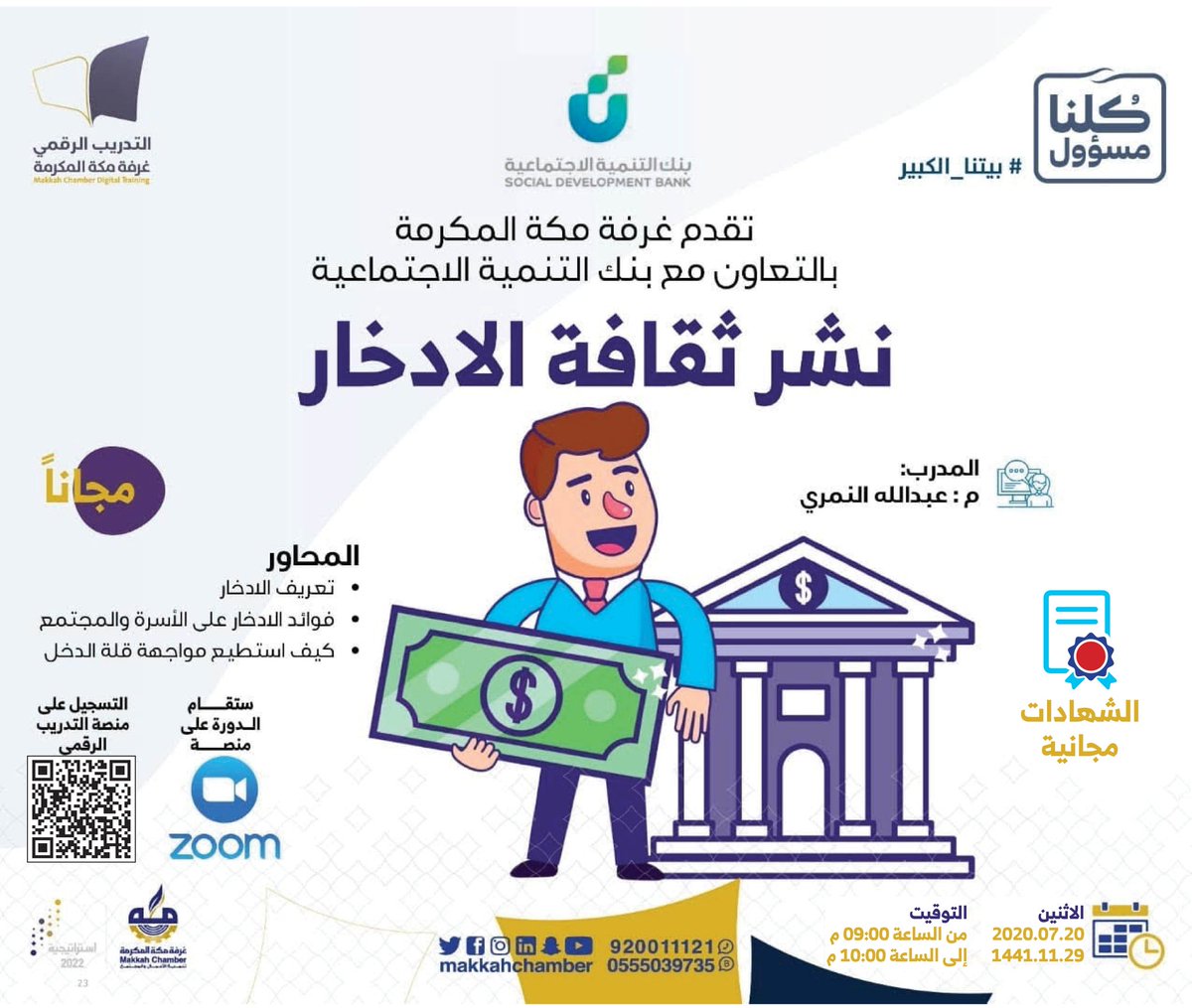 أعلنت غرفة مكة المكرمة بالتعاون مع بنك التنمية الاجتماعية إقامة دورة تدريبية مجانية (عن بُعد)، بعنوان (نشر ثقافة الإدخار)، مع شهادة مجانية، وذلك وفقاً لبقية التفاصيل الموضحة أدناه.