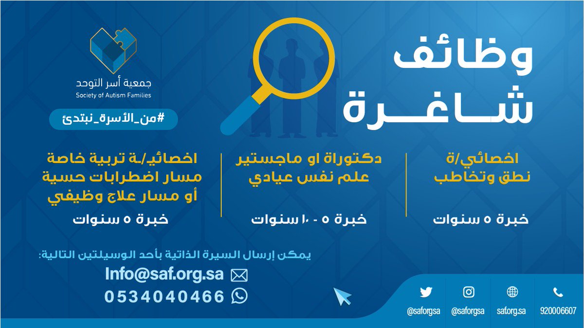 أعلنت جمعية أسر التوحد الخيرية (جمعية غير ربحية) توفر وظائف شاغرة لذوي الخبرة بمدينة الرياض، للعمل بالمسميات التالية (أخصائي نطق وتخاطب، ودكتوراه أو ماجستير علم نفس عيادي، وأخصائي تربية خاصة)، وذلك وفقاً لبقية التفاصيل الموضحة أدناه.