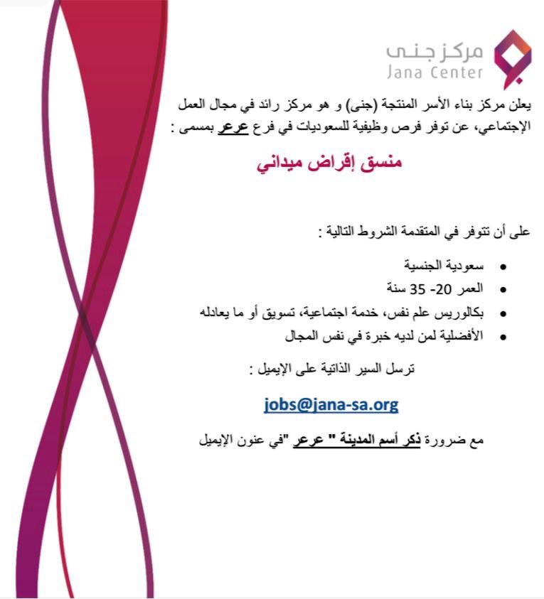 أعلن مركز بناء الأسر المنتجة (جنى) توفر وظيفة نسائية شاغرة، لحملة البكالوريوس، للعمل بفرع المركز بعرعر، بمسمى (مُنسق إقراض ميداني)، واشترط المركز أن تكون المتقدمة سعودية الجنسية، وذلك وفقاً لطريقة التقديم الموضحة أدناه.