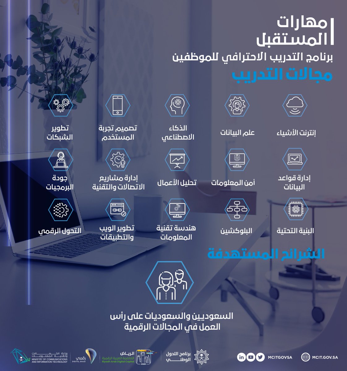 أعلنت وزارة الإتصالات وتقنية المعلومات في إطار مبادرة (مهارات المستقبل)، في مرحلته الأولى فرص تدريبية نوعية لأكثر من 5000 موظف وموظفة في أكثر من 15 مجال نوعي، ليكونوا جزء فعّال في رحلة التحول الرقمي، وذلك وفقاً للتفاصيل الموضحة أدناه.
