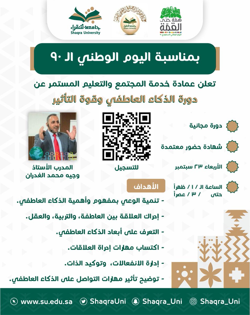 أعلنت جامعة شقراء مُمثلة في عمادة خدمة المجتمع والتعليم المستمر دورة بعنوان (الذكاء العاطفي وقوة التأثير) بمناسبة اليوم الوطني (90)، وذلك وفقاً للتفاصيل وطريقة التسجيل الموضحة أدناه.