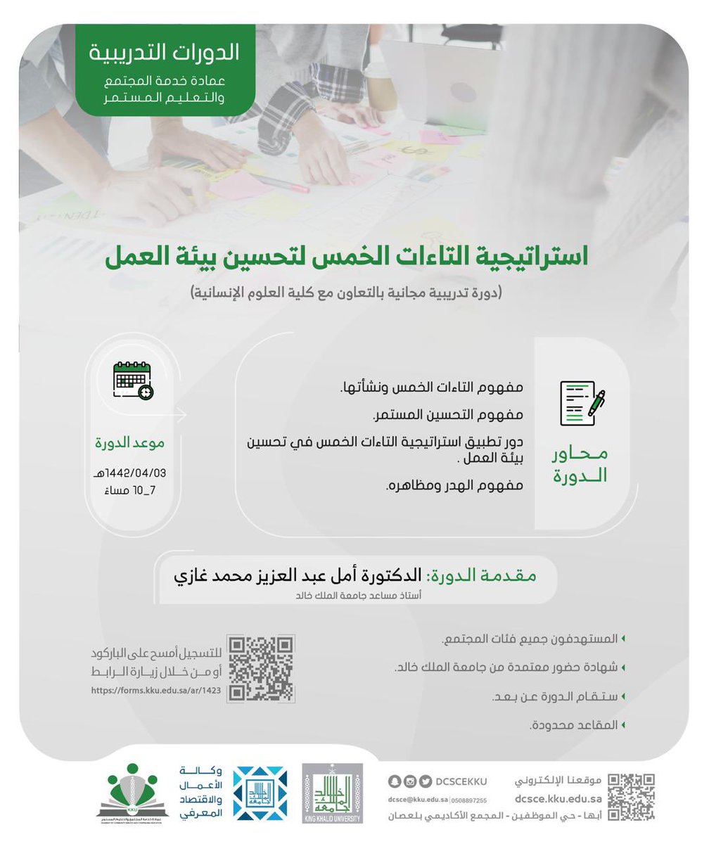 أعلنت جامعة الملك خالد مُمثلة في عمادة خدمة المجتمع والتعليم المستمر بالتعاون مع كلية العلوم الإنسانية عن إقامة دورة تدريبية مجانية بعنوان (استراتيجية التاءات الخمس لتحسين بيئة العمل)، وذلك وفقاً للتفاصيل الموضحة أدناه.