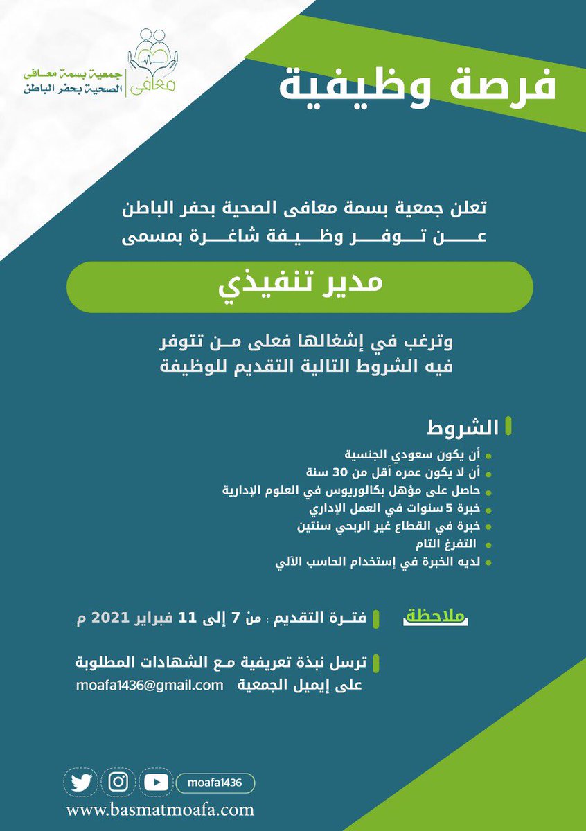 أعلنت جمعية بسمة معافى الصحية بحفر الباطن توفر وظيفة إدارية شاغرة، للعمل بمسمى (مدير تنفيذي)، وذلك وفقاً للتفاصيل وطريقة التقديم الموضحة أدناه.