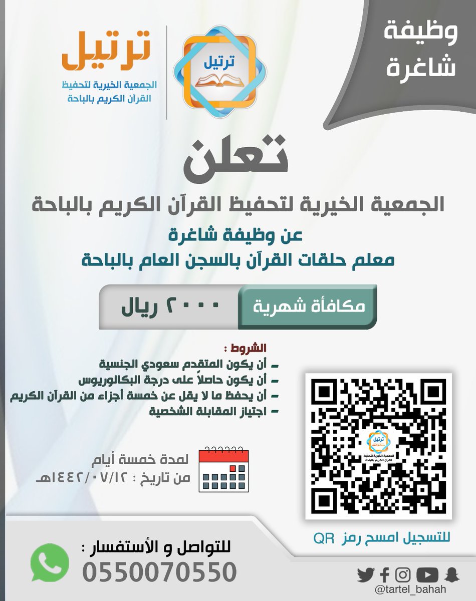 أعلنت الجمعية الخيرية لتحفيظ القرآن الكريم بالباحة (ترتيل) توفر وظيفة معلم قرآن بالسجن العام بالباحة، بمكافأة شهرية (2,000 ريال)، وذلك وفقاً لطريقة التقديم الموضحة أدناه.