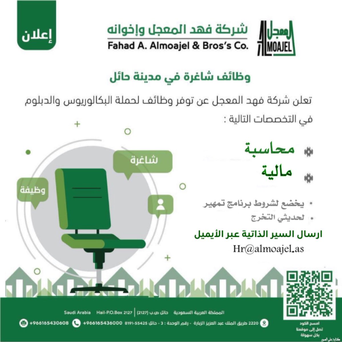 أعلنت شركة فهد المعجل وإخوانه توفر وظائف شاغرة لحملة الدبلوم فما فوق بمدينة حائل، في التخصصات التالية (المالية، المحاسبة)، وذلك وفقاً للتفاصيل الموضحة أدناه.