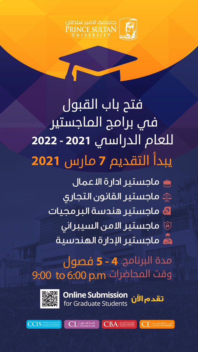 أعلنت جامعة الأمير سلطان بمدينة الرياض فتح باب القبول لبرامج الماجستير للعام الجامعي 2022/2021م، وذلك وفقاً للتفاصيل وطريقة التسجيل الموضحة أدناه.