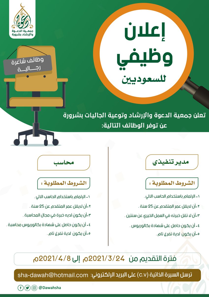 أعلت جمعية الدعوة والإرشاد وتوعية الجاليات بمحافظة شرورة توفر وظائف إدارية شاغرة لحملة البكالوريوس، وذلك وفقاً للتفاصيل وطريقة التقديم الموضحة أدناه.