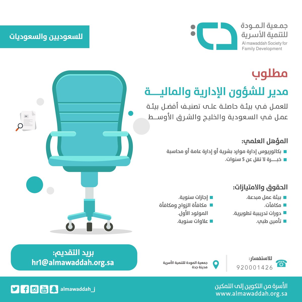 أعلنت جمعية المودة للتنمية الأسرية بمحافظة جدة توفر وظيفة إدارية شاغرة (للرجال والنساء)، للعمل بمسمى (مدير للشؤون الإدارية والمالية)، وذلك وفقاً لبقية التفاصيل وطريقة التقديم الموضحة أدناه.