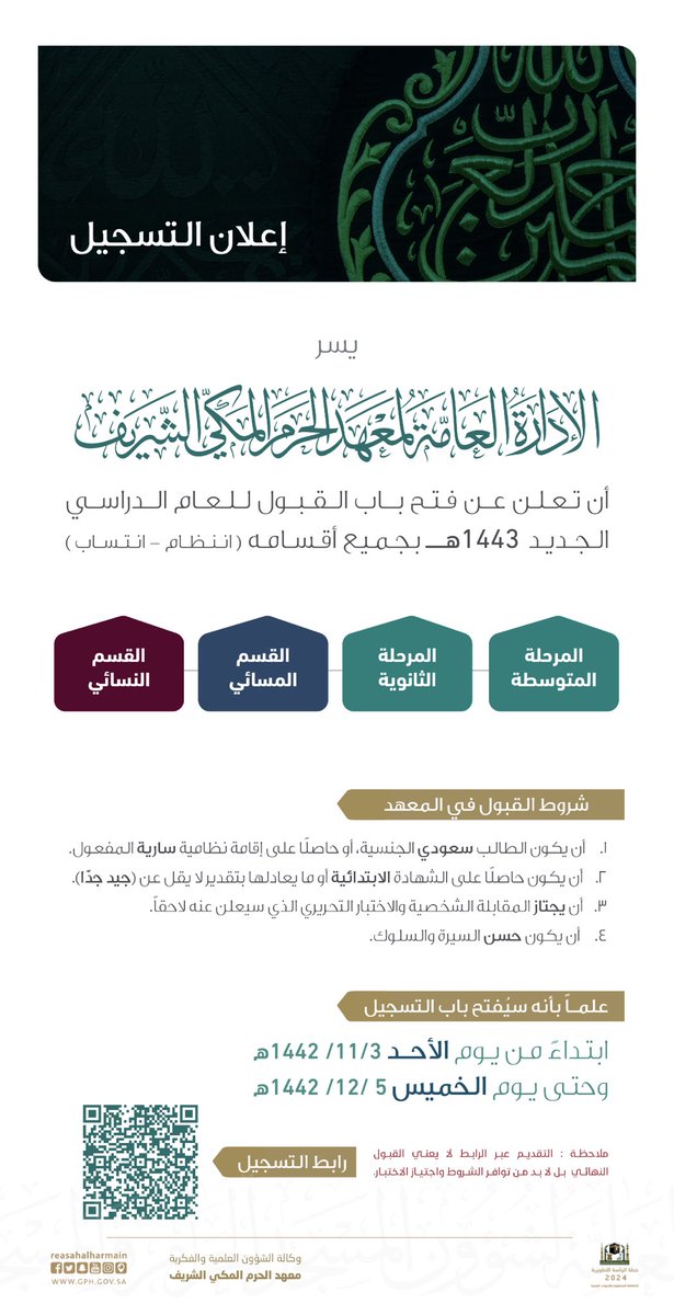 ![]() | معهد الحرم المكي الشريف فتح باب القبول للعام الدراسي 1443هـ بجميع أقسامه. | الموقع |