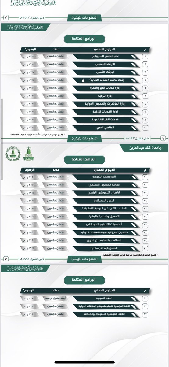أعلنت جامعة الملك عبدالعزيز مُمثلة في عمادة خدمة المجتمع والتعليم المستمر عن بدء التقديم في برامج (الدبلومات المهنية) عدد 23 برنامج للعام الدراسي 1443هـ، وذلك وفقاً للتفاصيل وطريقة التقديم الموضحة أدناه.