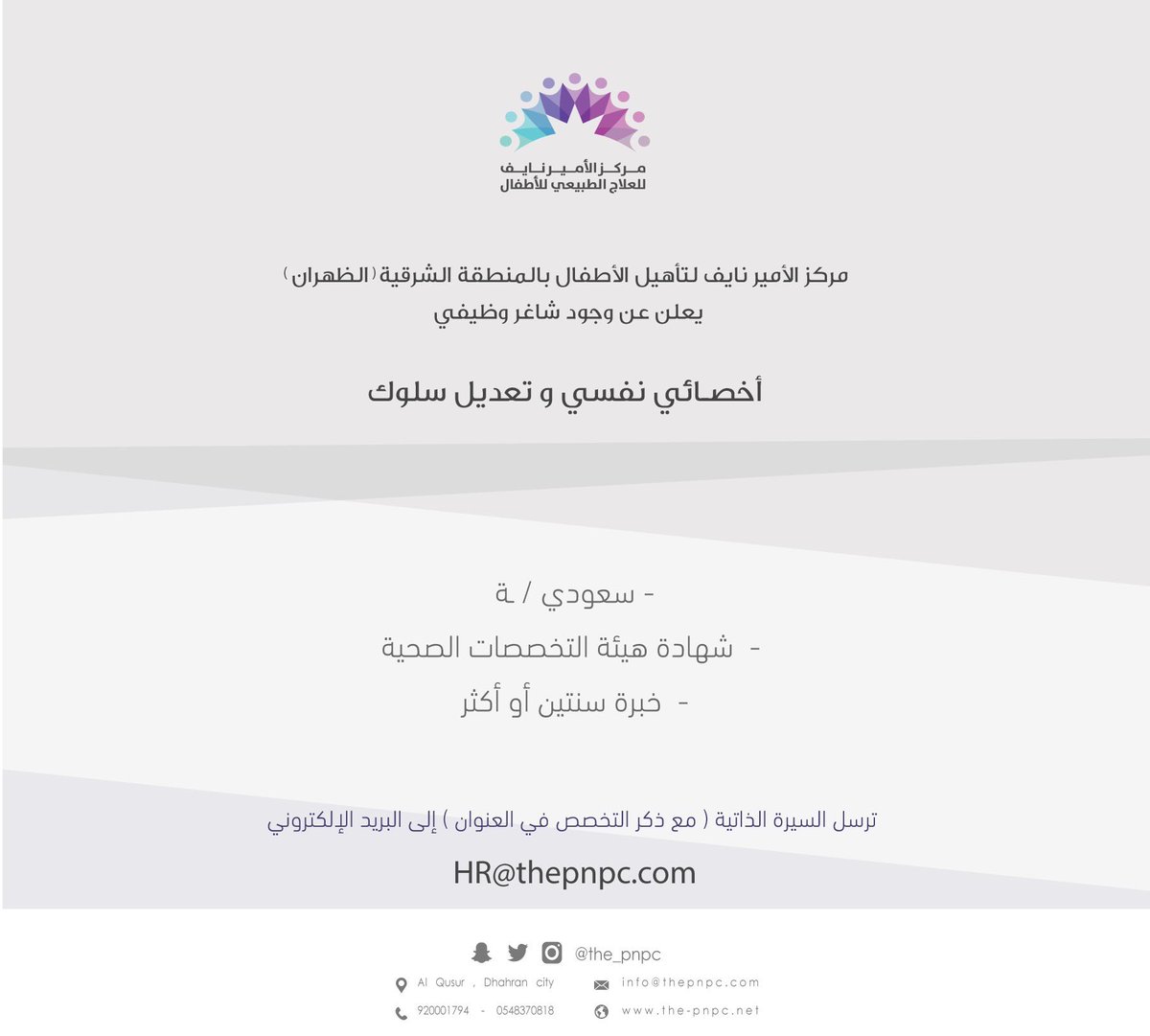 مركز الأمير نايف لتأهيل الأطفال | الظهران | - أخصائي علاج وظيفي - أخصائي نفسي | الشروط والتفاصيل (1) HR@the-pnpc.net |