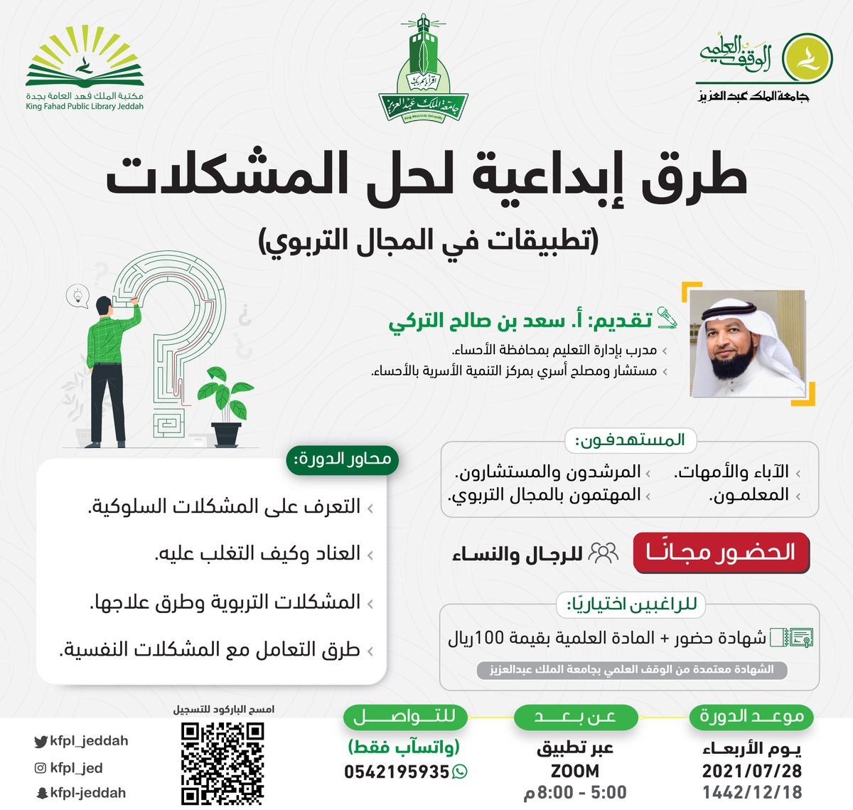 أعلنت مكتبة الملك فهد العامة بجدة ضمن سلسلة تطوير المهارات إقامة دورات تدريبية (عن بُعد) بعدة مجالات، وسوف يكون حضور الدورة (مجاني)، والشهادة (اختيارية برسوم)، وذلك وفقاً للتفاصيل الموضحة أدناه.