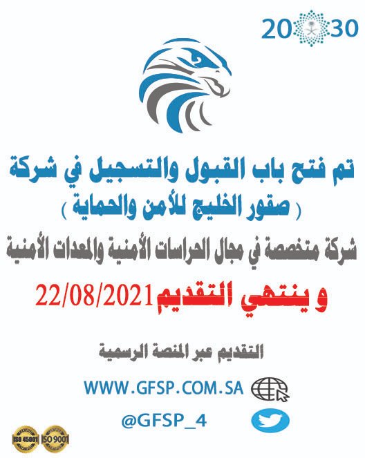 أعلنت شركة صقور الخليج للحراسات الأمنية توفر وظائف أمنية وفنية وإدارية (رجال / نساء) بعدة مناطق بالمملكة (المنطقة الوسطى، المنطقة الشرقية، المنطقة الغربية)، وذلك وفقاً للتفاصيل وطريقة التقديم الموضحة أدناه.