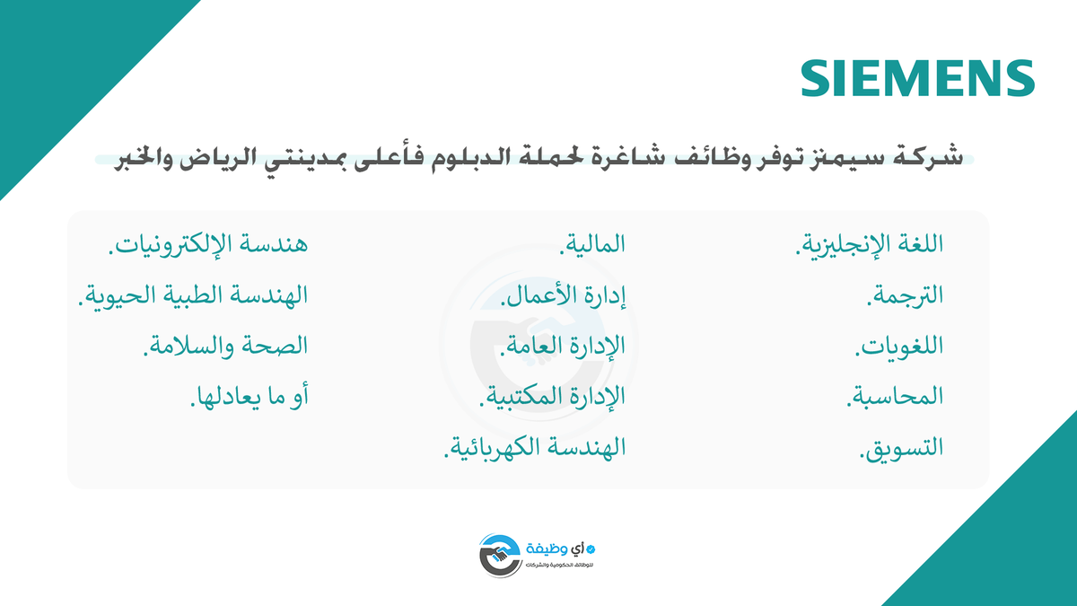 أعلنت شركة سيمنز عبر موقعها الإلكتروني (بوابة التوظيف) توفر وظائف شاغرة لحملة الدبلوم فأعلى بمدينتي الرياض والخبر، وذلك وفقاً للتفاصيل وطريقة التقديم الموضحة أدناه.