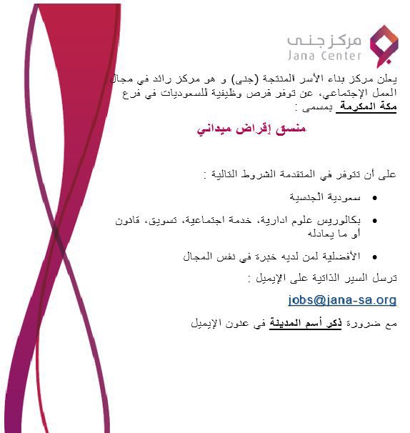 أعلن مركز بناء الأسر المنتجة (جنى) توفر وظائف شاغرة بمكة المكرمة وتبوك والدمام، وذلك وفقاً لطريقة التقديم الموضحة أدناه.