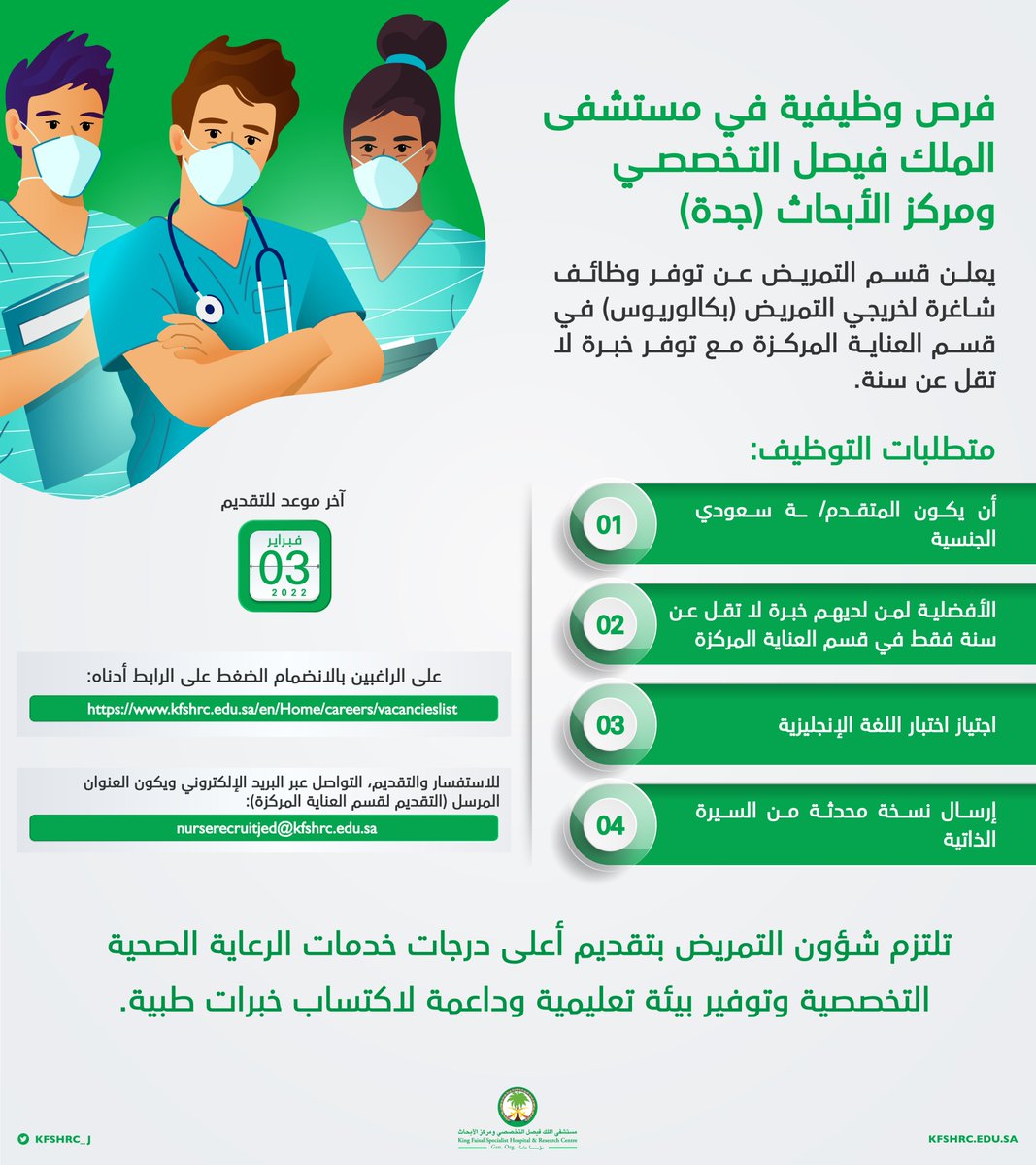 أعلن مستشفى الملك فيصل التخصصي ومركز الأبحاث بمحافظة جدة توفر فرص وظيفية لخريجي التمريض، واشترط المستشفى أن يكون المتقدم أو المتقدمة سعودي الجنسية، وذلك وفقاً للتفاصيل الموضحة أدناه.
