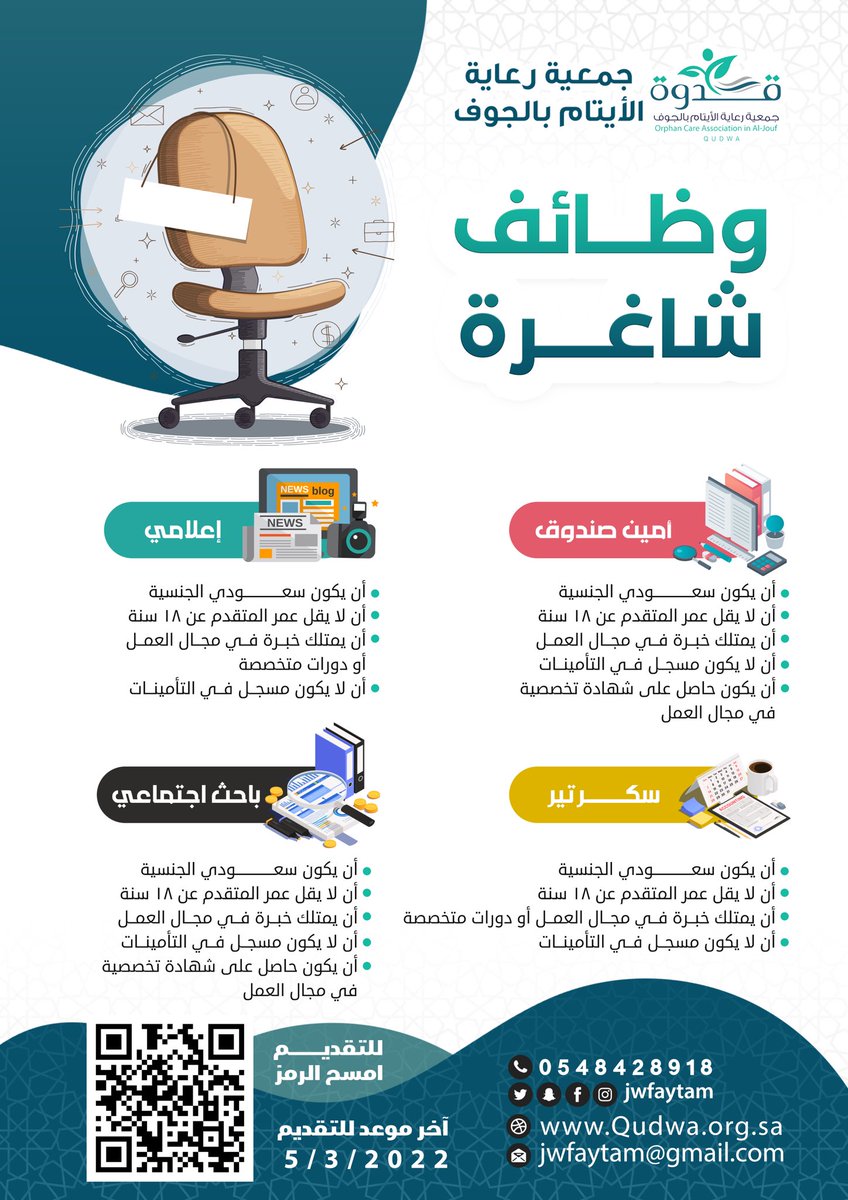 أعلنت جمعية رعاية الأيتام بالجوف (قدوة) توفر وظائف شاغرة في مختلف المجالات، واشترطت الجمعية أن يكون المتقدم سعودي الجنسية، وذلك وفقاً للتفاصيل وطريقة التقديم الموضحة أدناه.