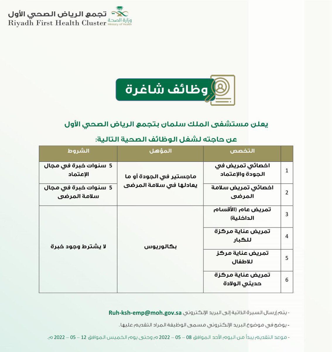 أعلن مستشفى الملك سلمان بن عبدالعزيز بالتجمع الصحي الأول بالرياض توفر وظائف صحية لحملة البكالوريوس فأعلى، وذلك وفقاً للتفاصيل وطريقة التقديم الموضحة أدناه.