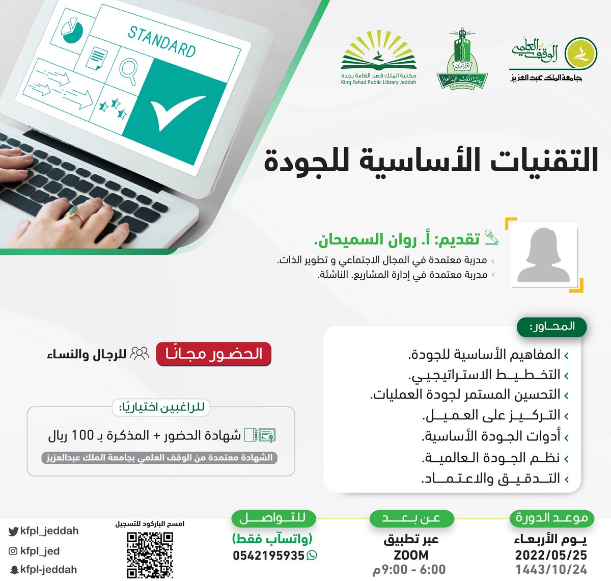 أعلنت مكتبة الملك فهد العامة بمحافظة جدة ضمن سلسلة تطوير المهارات إقامة دورات تدريبية (عن بُعد) بعدة مجالات، وسوف يكون حضور الدورات (مجاناً)، والشهادة (اختيارية برسوم)، وذلك وفقاً للتفاصيل الموضحة أدناه.