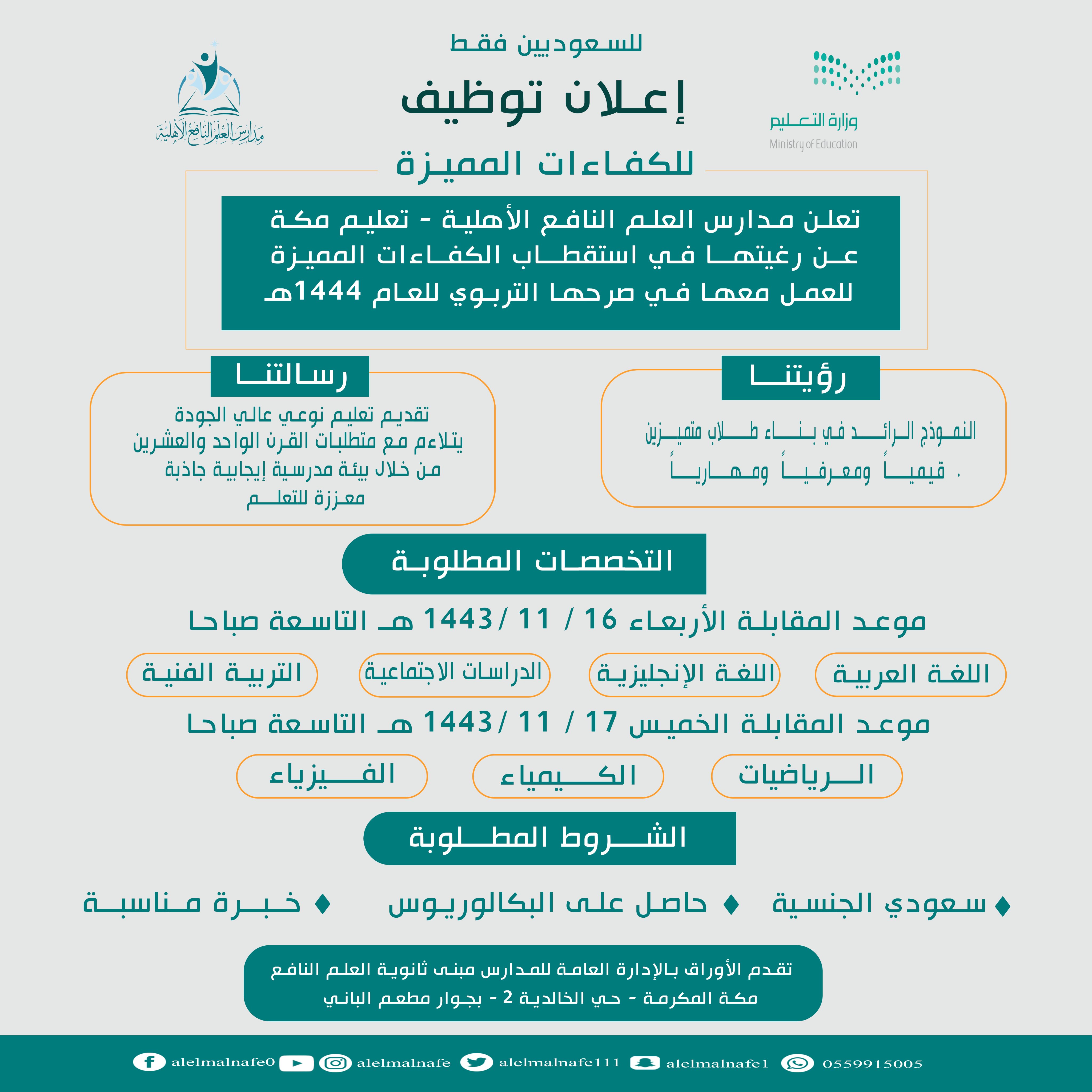 أعلنت مدارس العلم النافع الأهلية (بنين) بمكة المكرمة توفر وظائف تعليمية في بعض التخصصات للعام الدراسي 1444هـ، وذلك وفقاً للشروط وطريقة التقديم الموضحة أدناه.