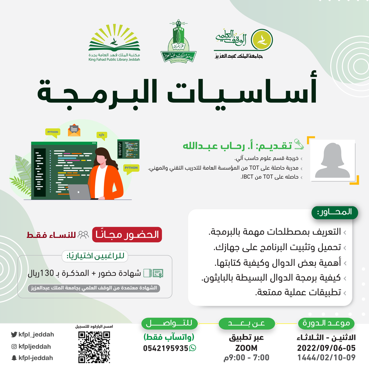 أعلنت مكتبة الملك فهد العامة بمحافظة جدة ضمن سلسلة تطوير المهارات إقامة دورات تدريبية (عن بُعد) و (حضوري) بعدة مجالات، وسوف يكون حضور الدورات (مجاناً)، والشهادة (اختيارية برسوم)، وذلك وفقاً للتفاصيل الموضحة أدناه.