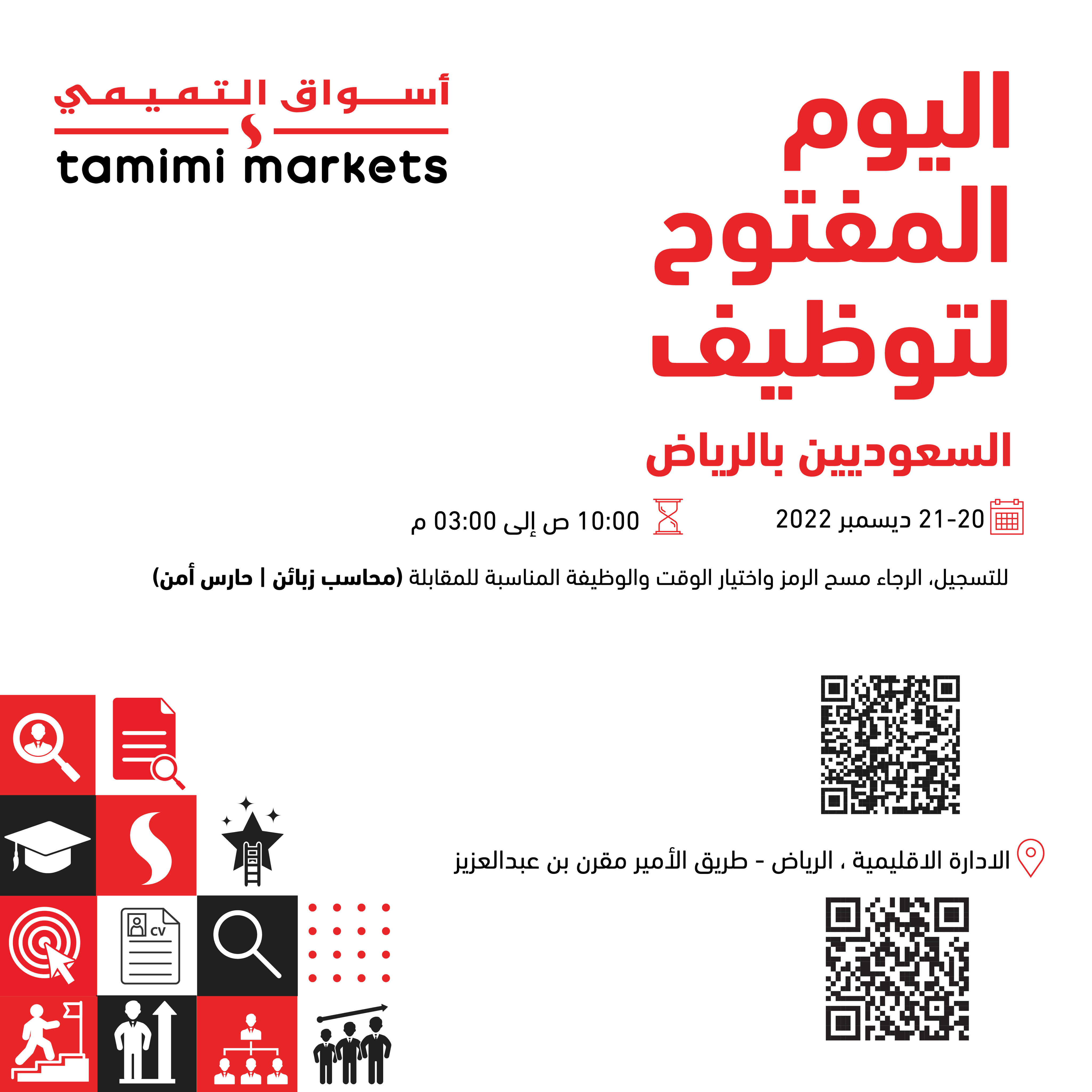 أعلنت أسواق التميمي عن موعد إقامة (اليوم المفتوح للتوظيف) يومي (الثلاثاء) و (الأربعاء) بمدينة الرياض، وذلك وفقاً للتفاصيل الموضحة أدناه.