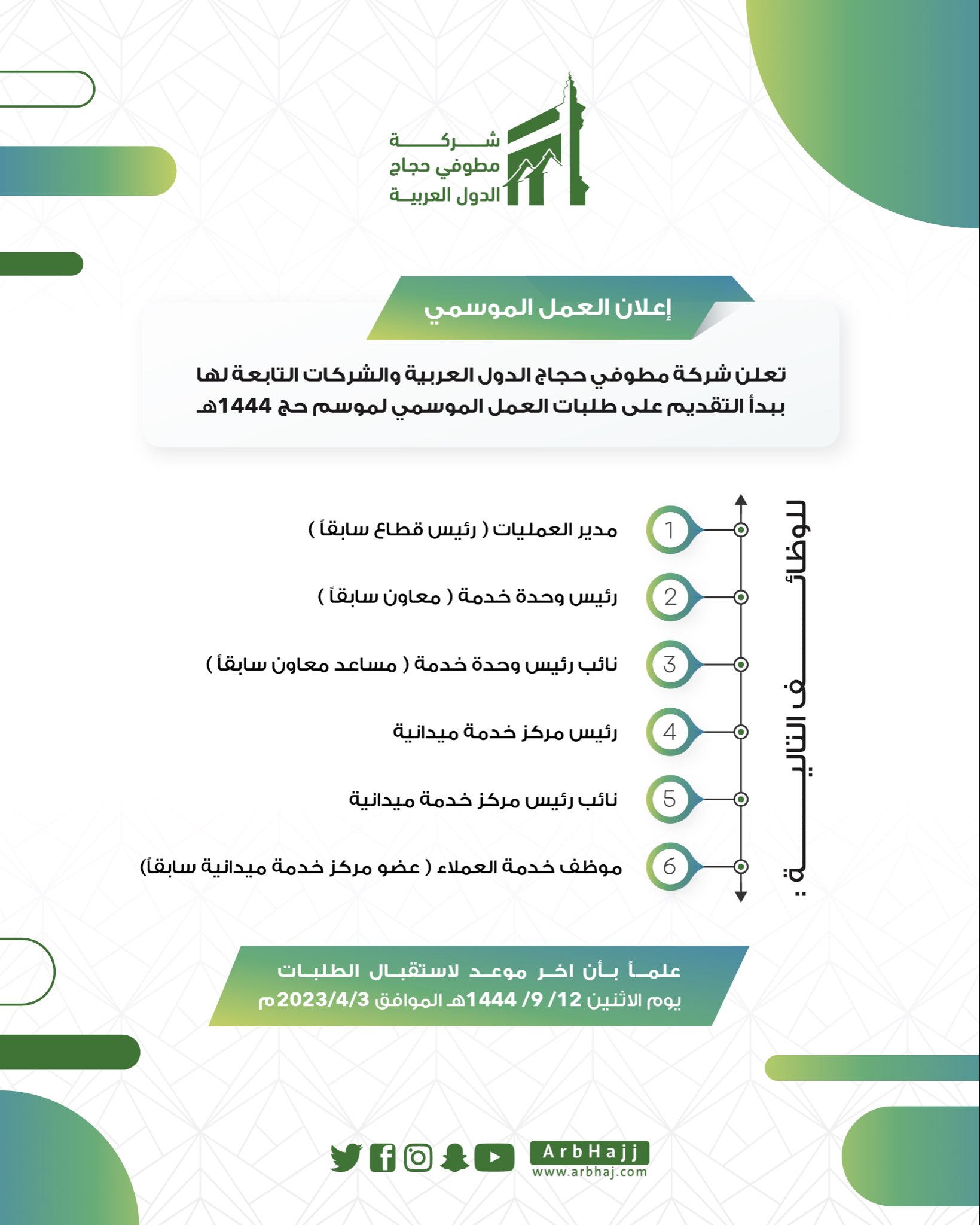 أعلنت شركة مطوفي حجاج الدول العربية والشركات التابعة بدء استقبال طلبات التوظيف الموسمي لموسم حج 1444هـ، وذلك وفقاً للمواعيد الموضحة أدناه.