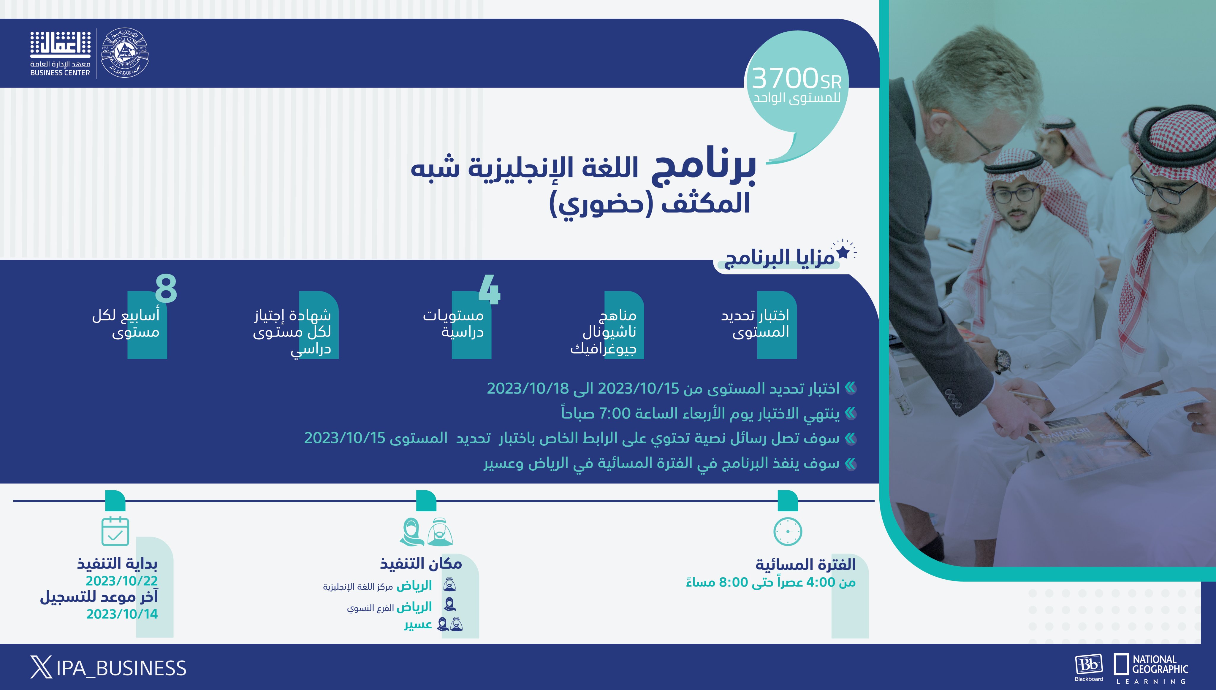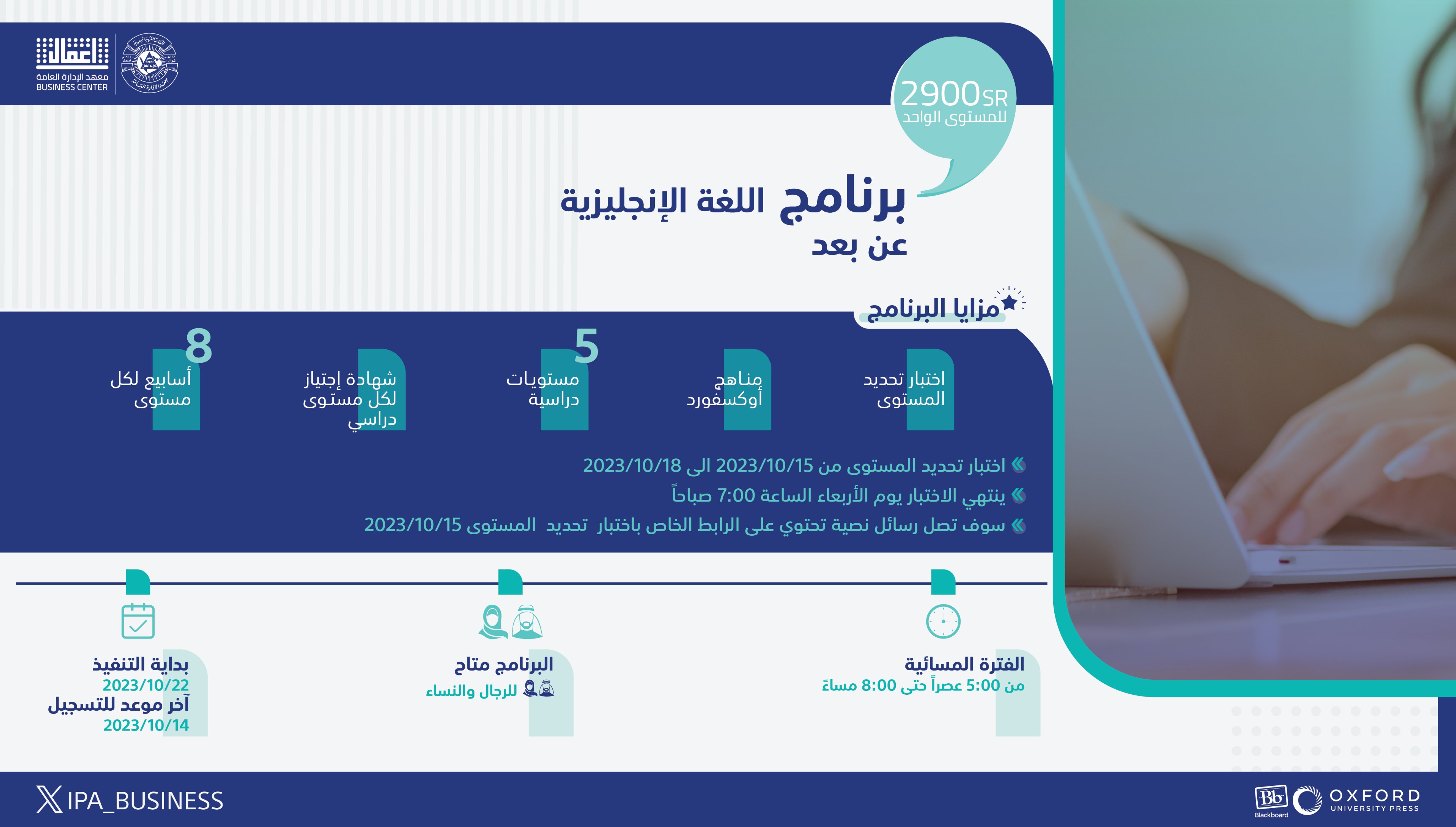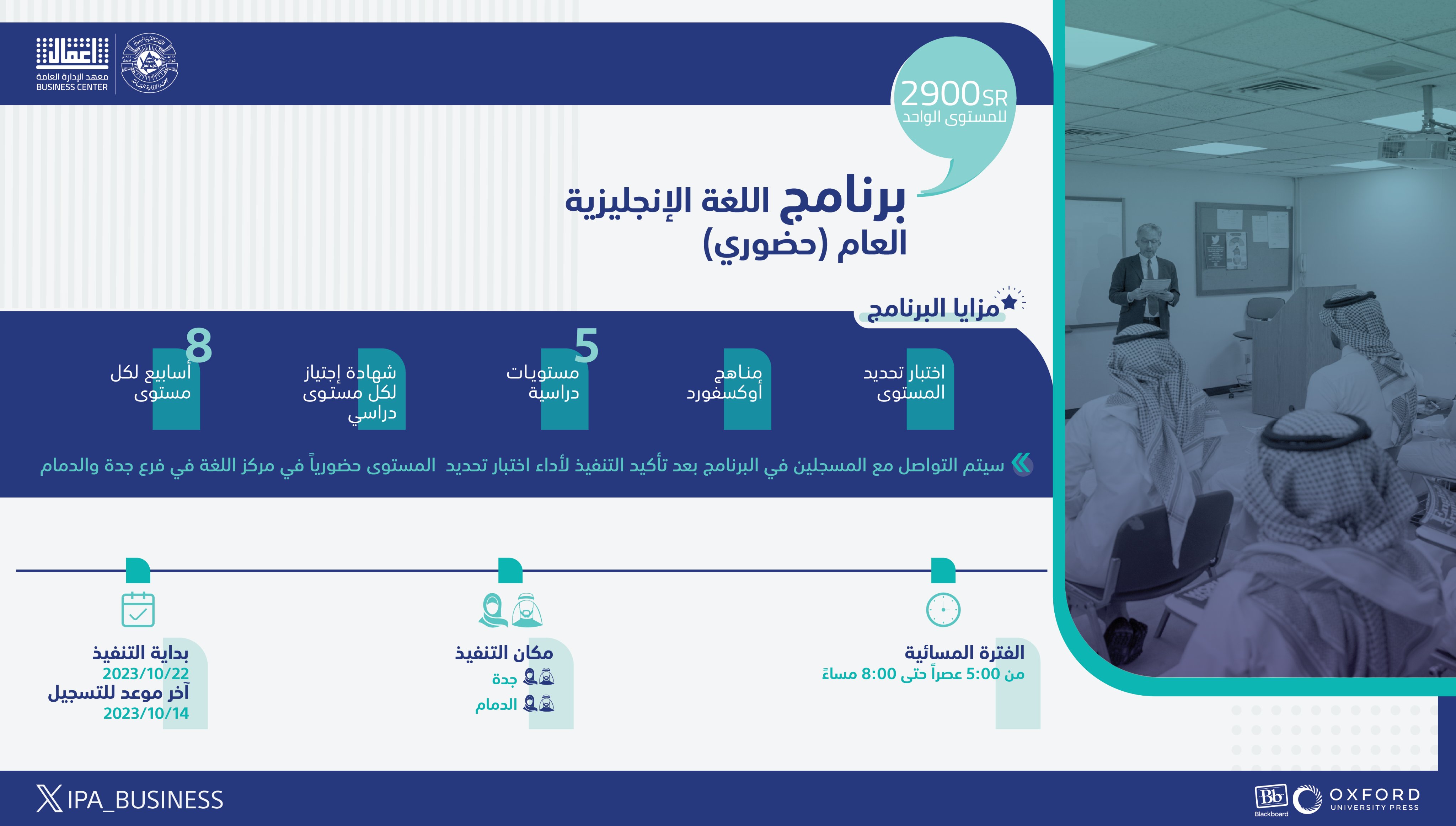 أعلن معهد الإدارة العامة مُمثلاً في مركز الأعمال فتح التسجيل (رجال / نساء) في برامج اللغة الإنجليزية، وذلك وفقاً للتفاصيل وطريقة التسجيل الموضحة أدناه.