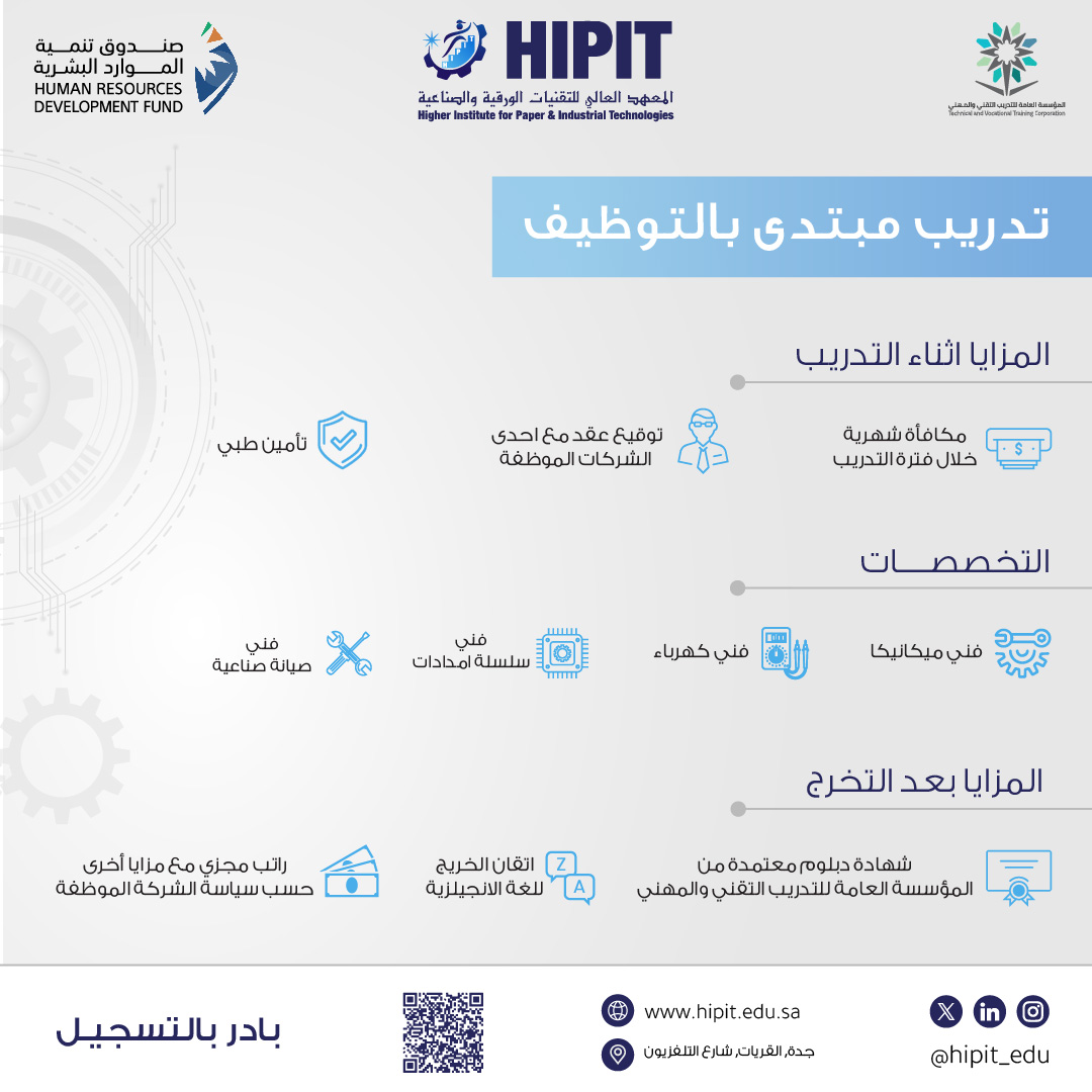 أعلن المعهد العالي للتقنيات الورقية والصناعية (هايبت) بدء التسجيل لحملة (الثانوية العامة) في برنامج الدبلوم المبتدئ بالتوظيف للفصل التدريبي ديسمبر لعام 2023م، مع إحدى الشركات الموظفة، وذلك وفقاً للتفاصيل وطريقة التقديم الموضحة أدناه.
