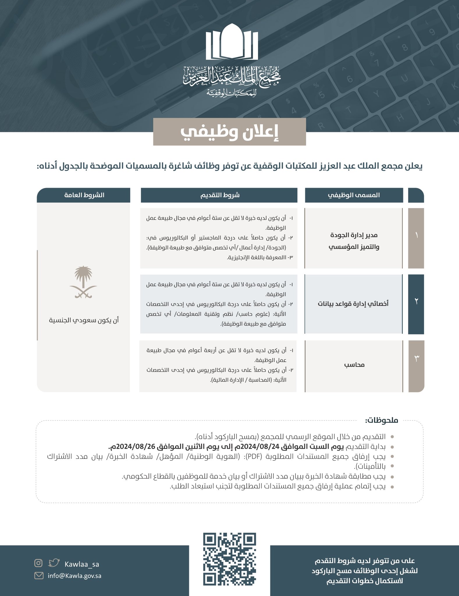 أعلن مجمع الملك عبدالعزيز للمكتبات الوقفية توفر وظائف شاغرة (بكالوريوس فأعلى)، وذلك وفقًا للتفاصيل وطريقة التقديم الموضحة أدناه.