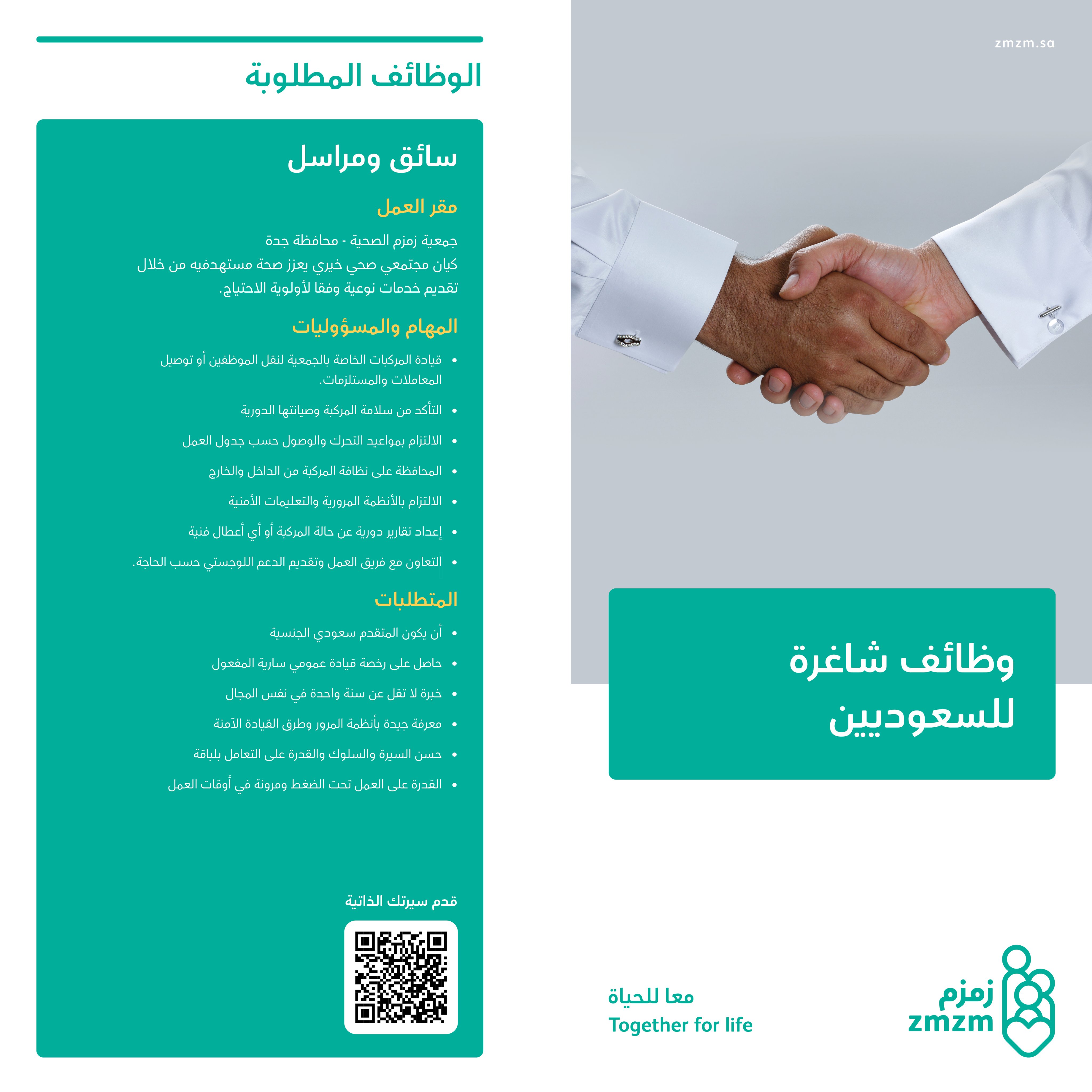 أعلنت جمعية زمزم للخدمات الصحية عن رغبتها في شغل وظيفة (سائق ومراسل) ضمن فريق العمل بمدينة جدة، وذلك لتلبية احتياجات النقل والتوصيل وفق أعلى معايير السلامة والانضباط، وذلك وفقاً للتفاصيل الموضحة أدناه.