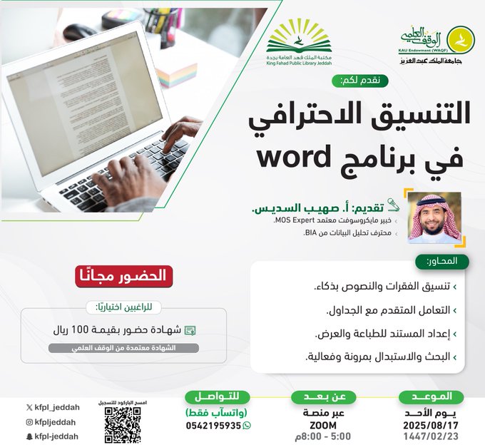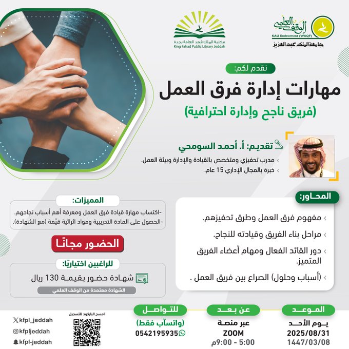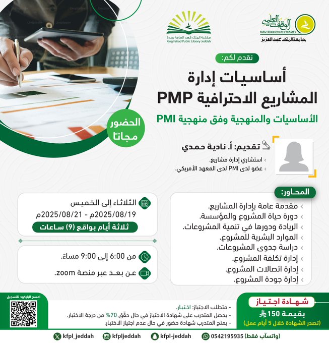 أعلنت مكتبة الملك فهد العامة بجدة بالتعاون مع الوقف العلمي بجامعة الملك عبدالعزيز عن إقامة 10 دورات تدريبية متنوعة (عن بُعد)، مع العلم أن حضور الدورات مجاني والشهادات اختيارية برسوم رمزية، وذلك وفقاً للتفاصيل الموضحة أدناه.