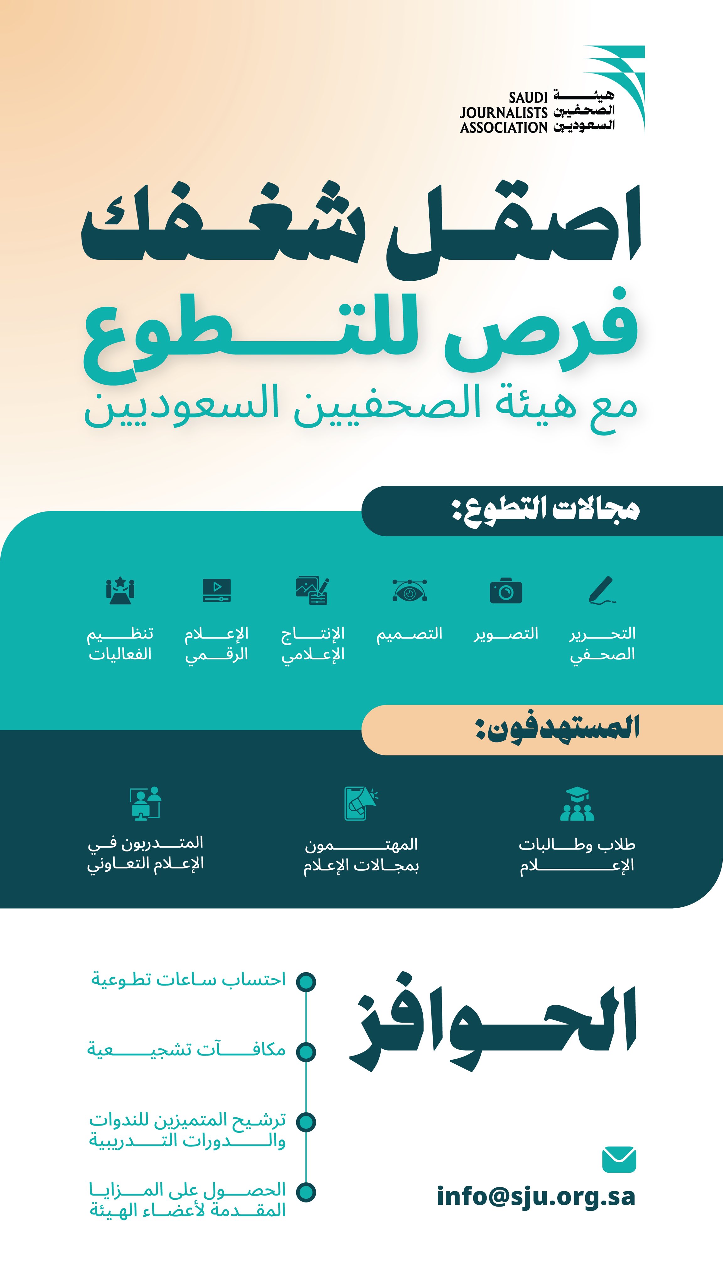 أعلنت هيئة الصحفيين السعوديين عن فتح باب التسجيل لفرص تطوعية مميزة في مختلف مجالات الإعلام، لتمكين الكفاءات الوطنية وتطوير مهاراتهم، وتقدم الهيئة حوافز مجزية وساعات تطوعية، وذلك وفقاً للتفاصيل الموضحة أدناه.
