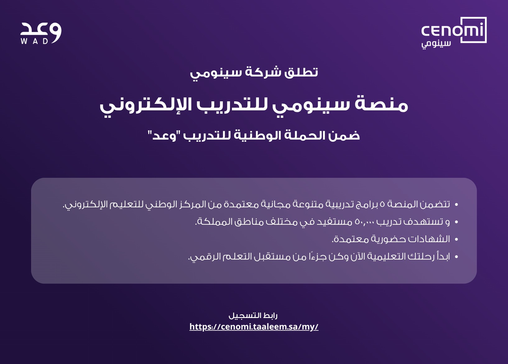 أطلقت شركة سينومي منصتها للتدريب الإلكتروني تحت اسم (وعد)، ضمن الحملة الوطنية للتدريب، بهدف تمكين 50,000 مستفيد من تطوير مهاراتهم وتعزيز جاهزيتهم لسوق العمل من خلال برامج مجانية معتمدة من المركز الوطني للتعليم الإلكتروني، وذلك وفقاً للتفاصيل الموضحة أدناه.