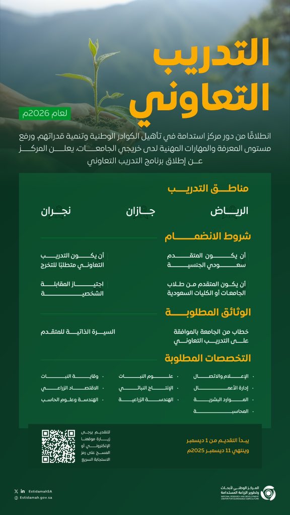 أعلن المركز الوطني لأبحاث وتطوير الزراعة المستدامة (استدامة) عن بدء استقبال طلبات الالتحاق ببرنامج التدريب التعاوني (عام 2026م) لطلاب وطالبات الجامعات، وذلك وفقاً للتفاصيل الموضحة أدناه.